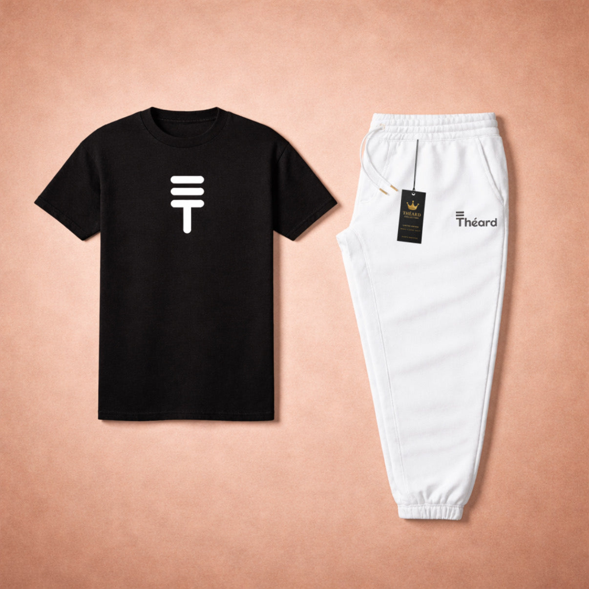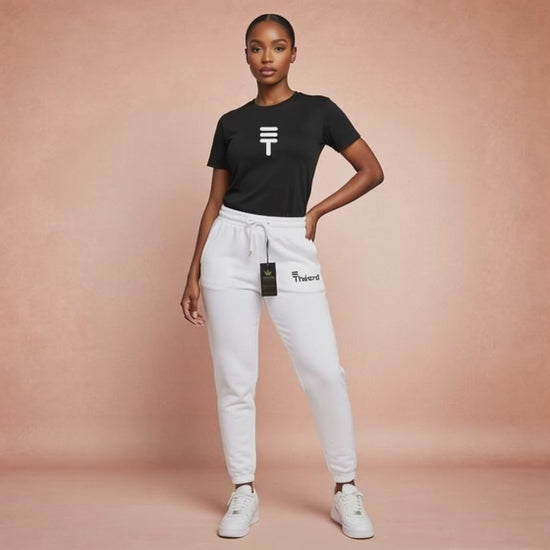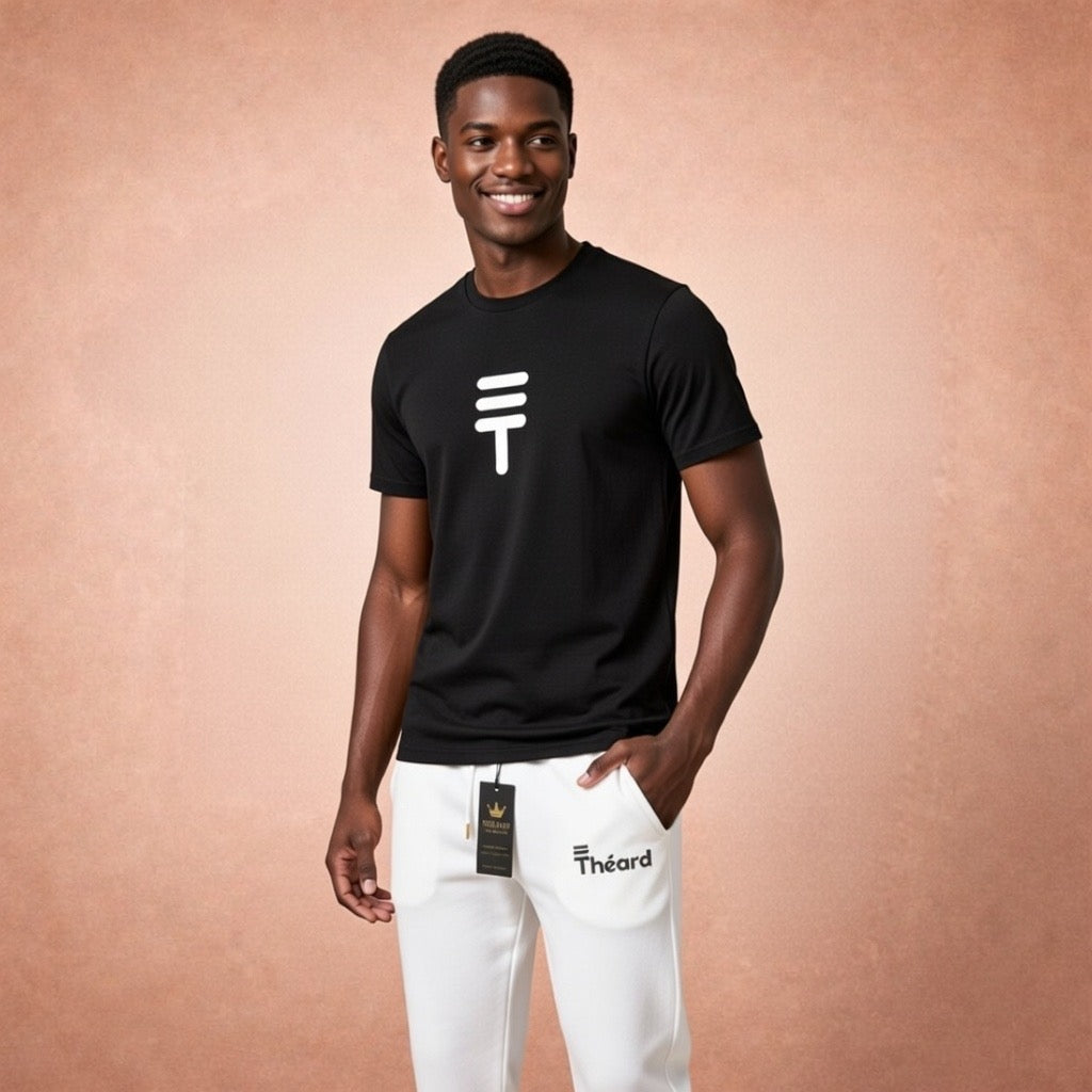 The Théard Icon Black & White Set is the definition of clean luxury. A jet-black tee with the iconic Théard symbol paired with crisp white joggers creates a high-contrast designer look that never goes out of style.