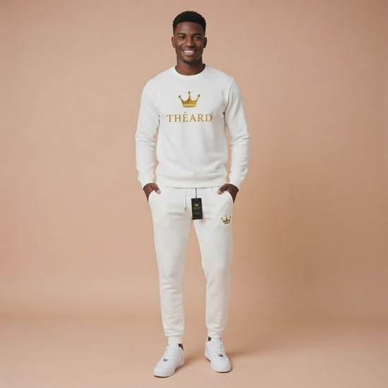 The Théard White Crown Set is the elevated luxury edition of your brand — crisp all-white with metallic gold crown detailing for a look that feels exclusive, rare, and high-end.